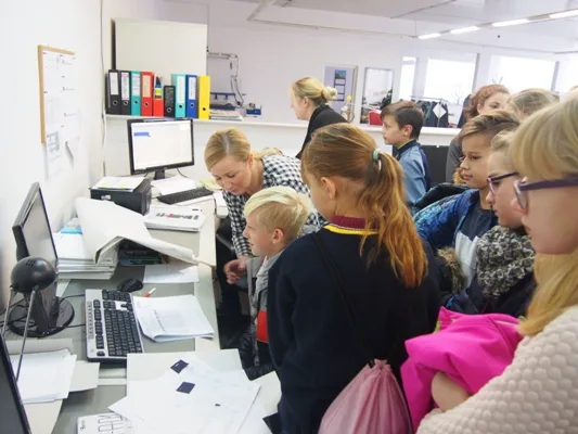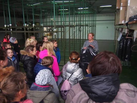 Dzieci zapoznane zostały także z kolejnymi etapami powstawania odzieży, dzięki temu poszerzyły swoją wiedzę i zdobyły nowe wiadomości. Wizyta zakończyła się miłą niespodzianką - uczestników zaproszono na słodki poczęstunek i obdarowano uszytymi dla nich piórnikami, w których znajdowały się akcesoria krawieckie. Ponadto szkoła otrzymała w prezencie materiały do praktycznej nauki posługiwania się igłą, z których uczniowie będą korzystali podczas zajęć technicznych. Bardzo dziękujemy dyrekcji i pracownikom zakładu za przybliżenie tajników swojej pracy, poświęcony nam czas i serdeczne przyjęcie.