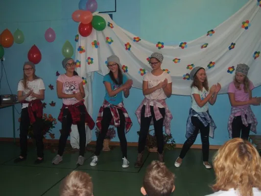 Młodzi artyści tańcem i słowem uświetnili ten wyjątkowy dzień w roku szkolnym. Przybyli na tę uroczystość nauczyciele, emerytowani nauczyciele i pracownicy szkoły usłyszeli wiele ciepłych słów. Uczniowie docenili i podkreślili swoją wdzięczność za codzienny trud pracy nauczyciela, jego poświęcenie, czujność i troskę o dobro wychowanków. Na zakończenie akademii głos zabrałaPani dyrektor Anna Dziewit, Pani vice wójt Renata Chruszcz oraz przewodnicząca Rady Rodziców Pani Joanna Rutkowska.