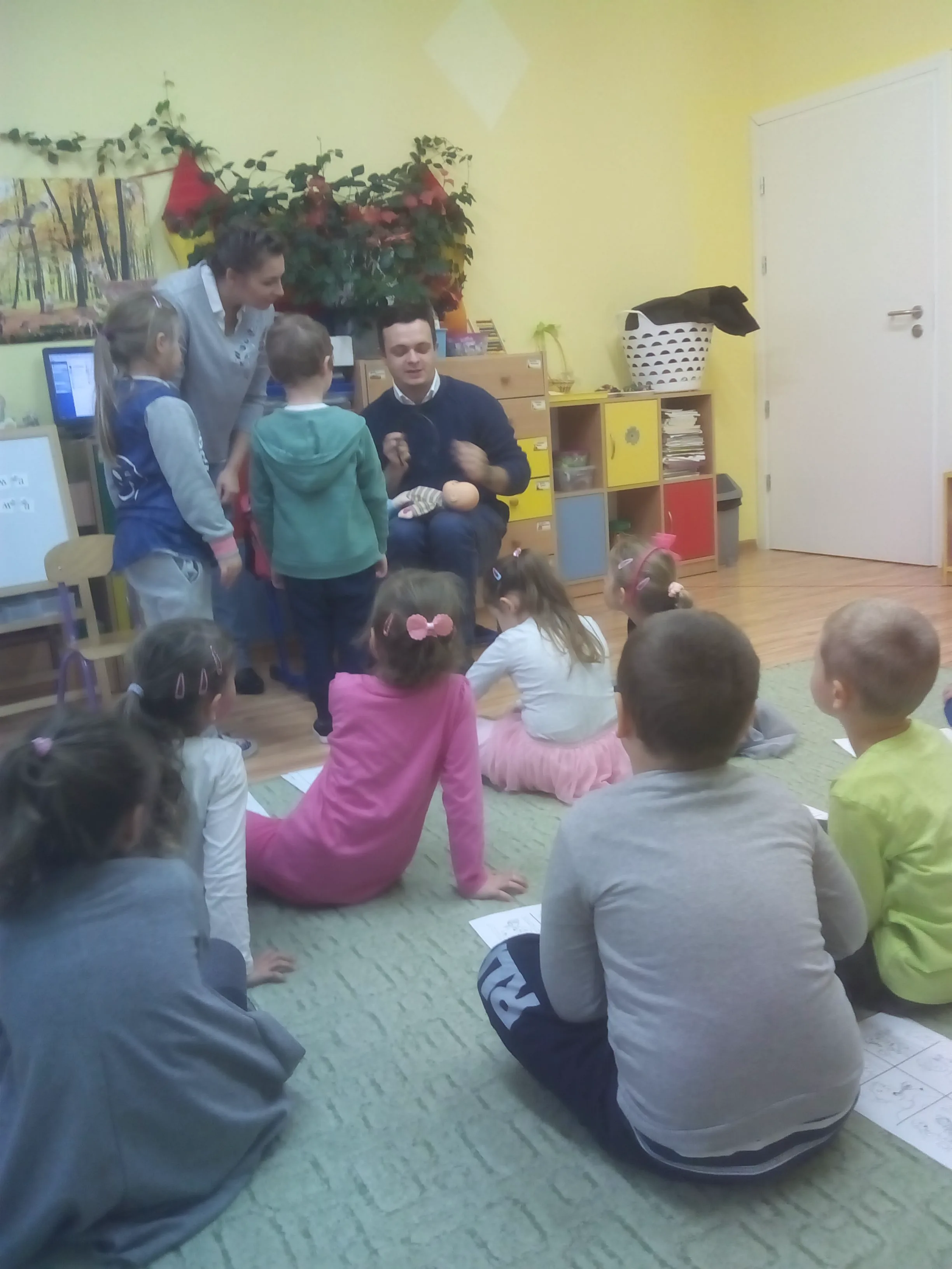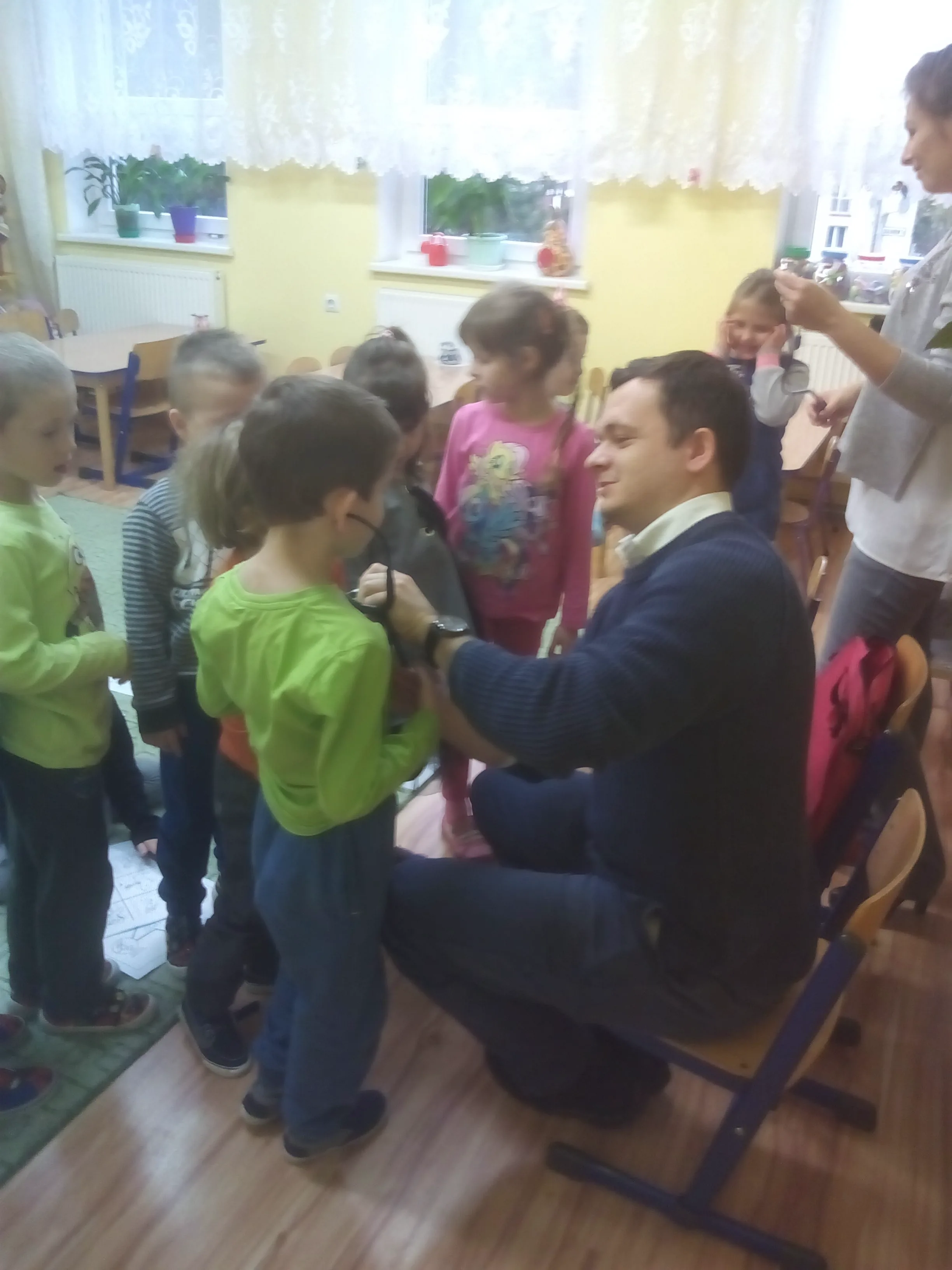 Mówili także o tym jak zapobiegać chorobom i co robić w czasie różnych zdrowotnych dolegliwości. Zwrócili uwagę na zakaz przyjmowania leków przez dzieci bez wiedzy dorosłych. Przedszkolaki miały możliwość posłuchania bicia własnego serca i serc swoich kolegów przez stetoskop. Profesjonalizm i empatyczne podejście naszych lekarzy do dzieci na pewno wpłyną na zmniejszenie lęku przedszkolaków przed czekającą ich w przyszłości wizytą w przychodni.