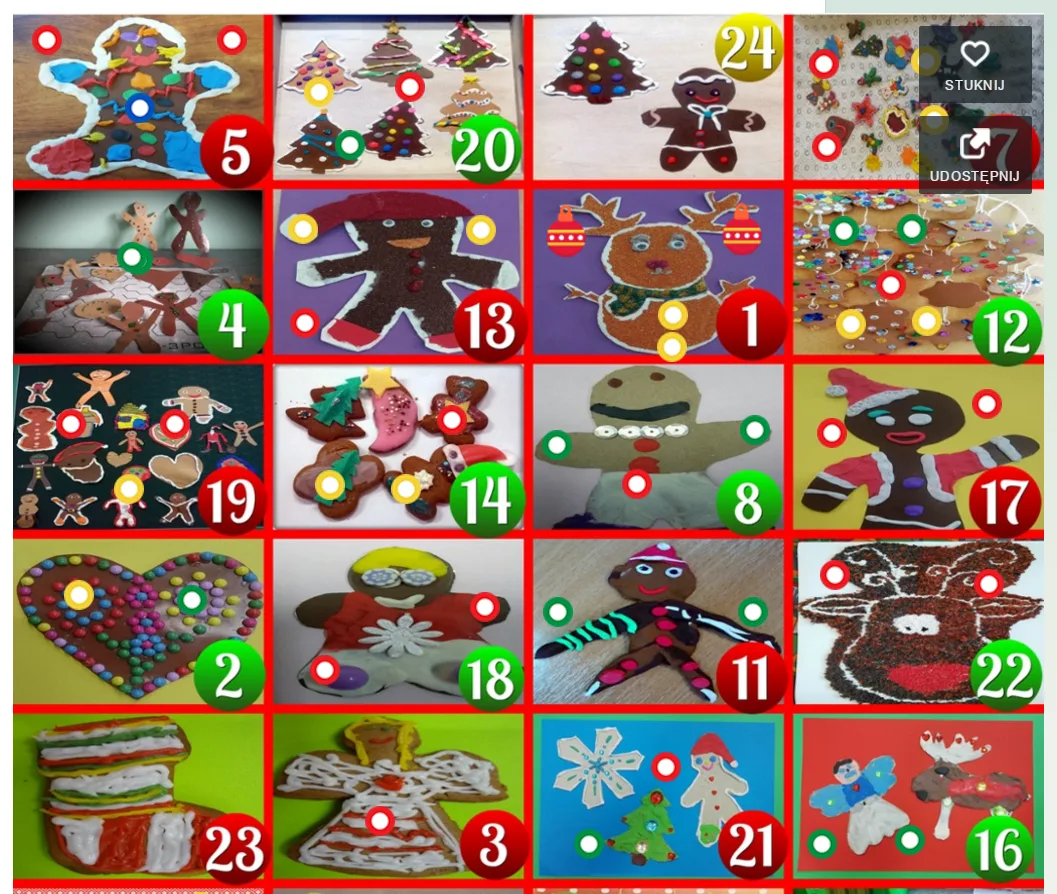 W ubiegłym roku podjęliśmy się wykonania zadań projektowych z sześcio- i siedmiolatkami z 1a. W tym roku realizowany jest w klasie 2a. Ciągle rozwija się, zatacza szersze kręgi i wprowadza niebywały nastrój. Projekt polega na tym, że we współpracy powstaje interaktywny kalendarz na czas oczekiwania. Najpierw powstają prace plastyczne dzieci, które zebrane razem tworzą świąteczny kolaż. Na każdy dzień przygotowywane są różne zadania, które doskonale wpisują się w realizację podstawy programowej oraz znacznie rozszerzają jej zakres. W okienkach kalendarza ukryte są różne gry interaktywne, zadania matematyczne, piosenki, zadania