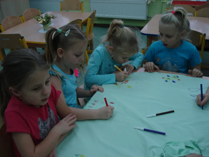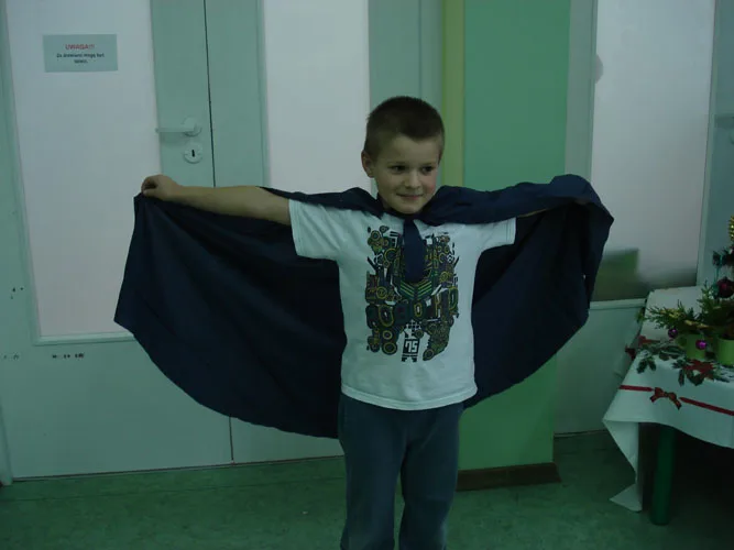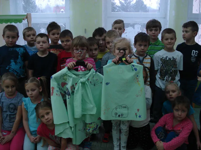 Dzieci obejrzały formy potrzebne do wykroju materiału, różnorodne materiały, guziki, zamki błyskawiczne. Następnie, z pomocą naszego gościa, dziewczynki wycięły formę spódnicy, a chłopcy pelerynę superbohatera. Potem w grupach dzieci ozdabiały swoje stroje. Podczas przymierzania ubrań było mnóstwo śmiechu i radości. Serdecznie dziękujemy pani Małaj za przyjęcie zaproszenia i za wspaniałe zajęcia.